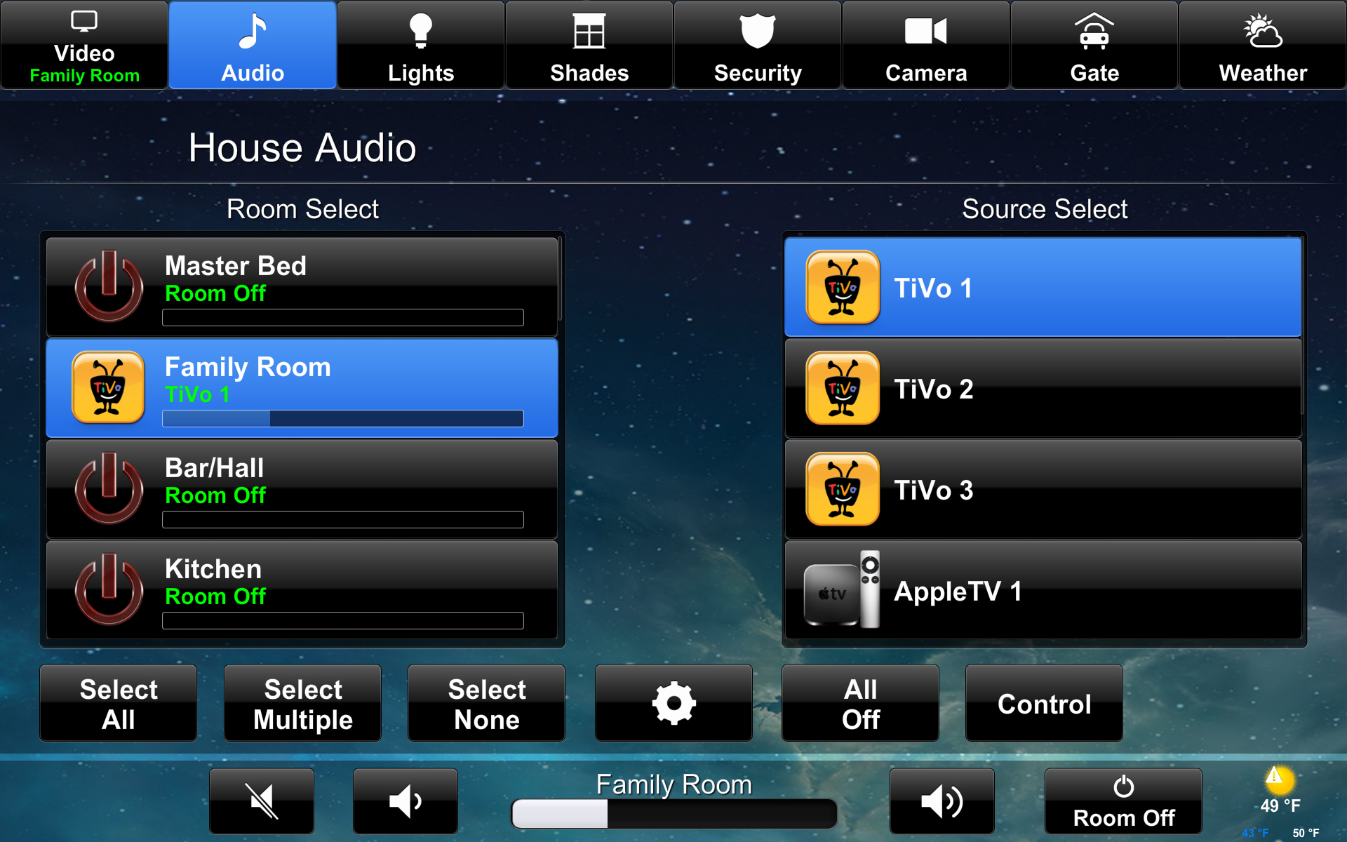 Have all your rooms status and control at your fingertips. Selecting your room or multiples make it easy to play music throughout your house!